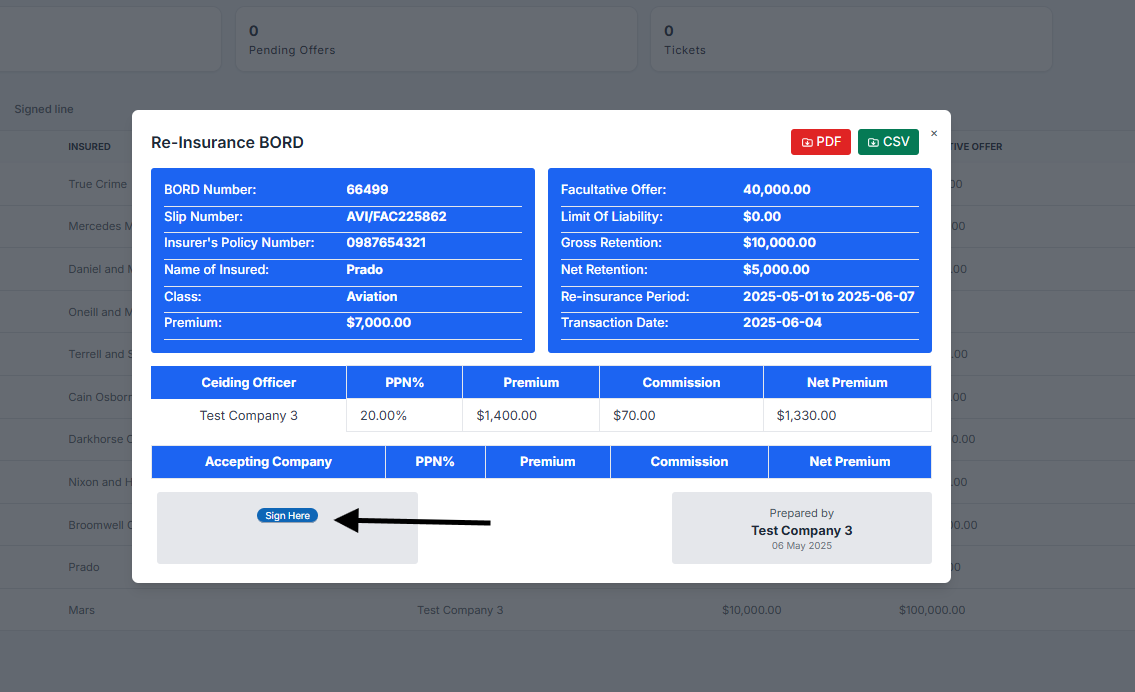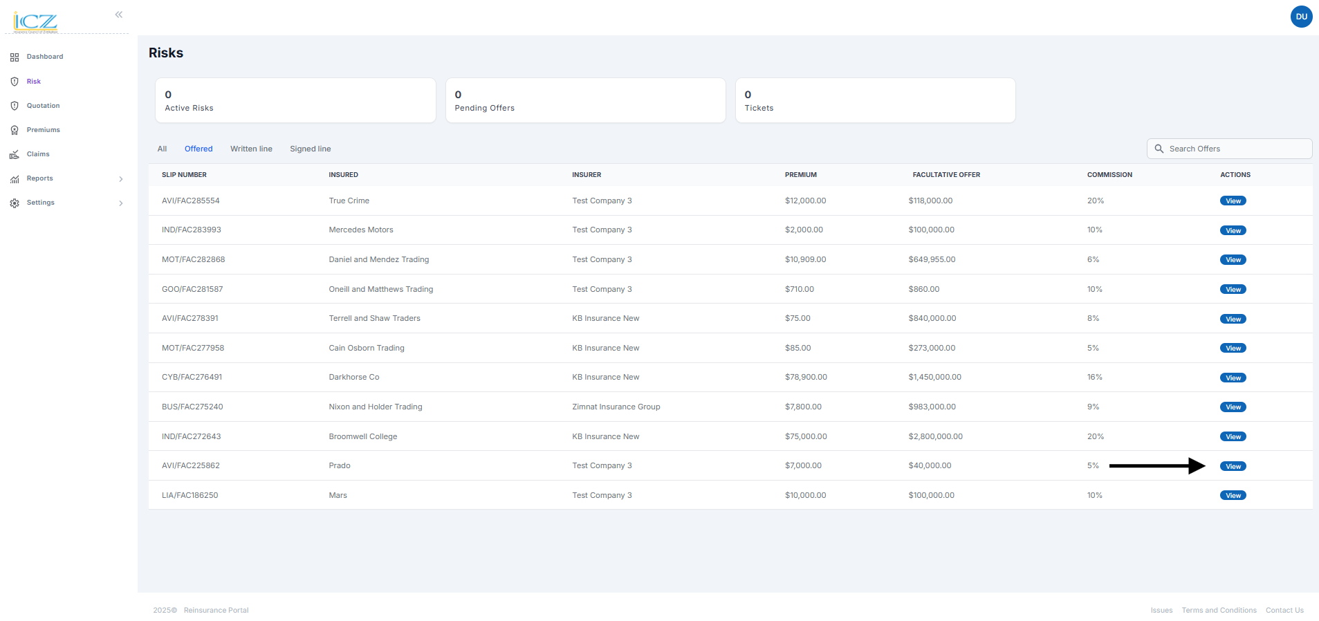 Steps for the ceding office to accept a risk offer Navigate to the written line table and click vie...
