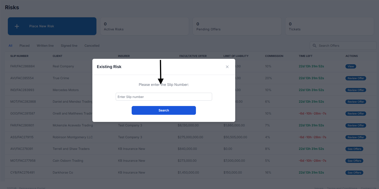 Enter a Reinsurance Slip Number for an existing risk
