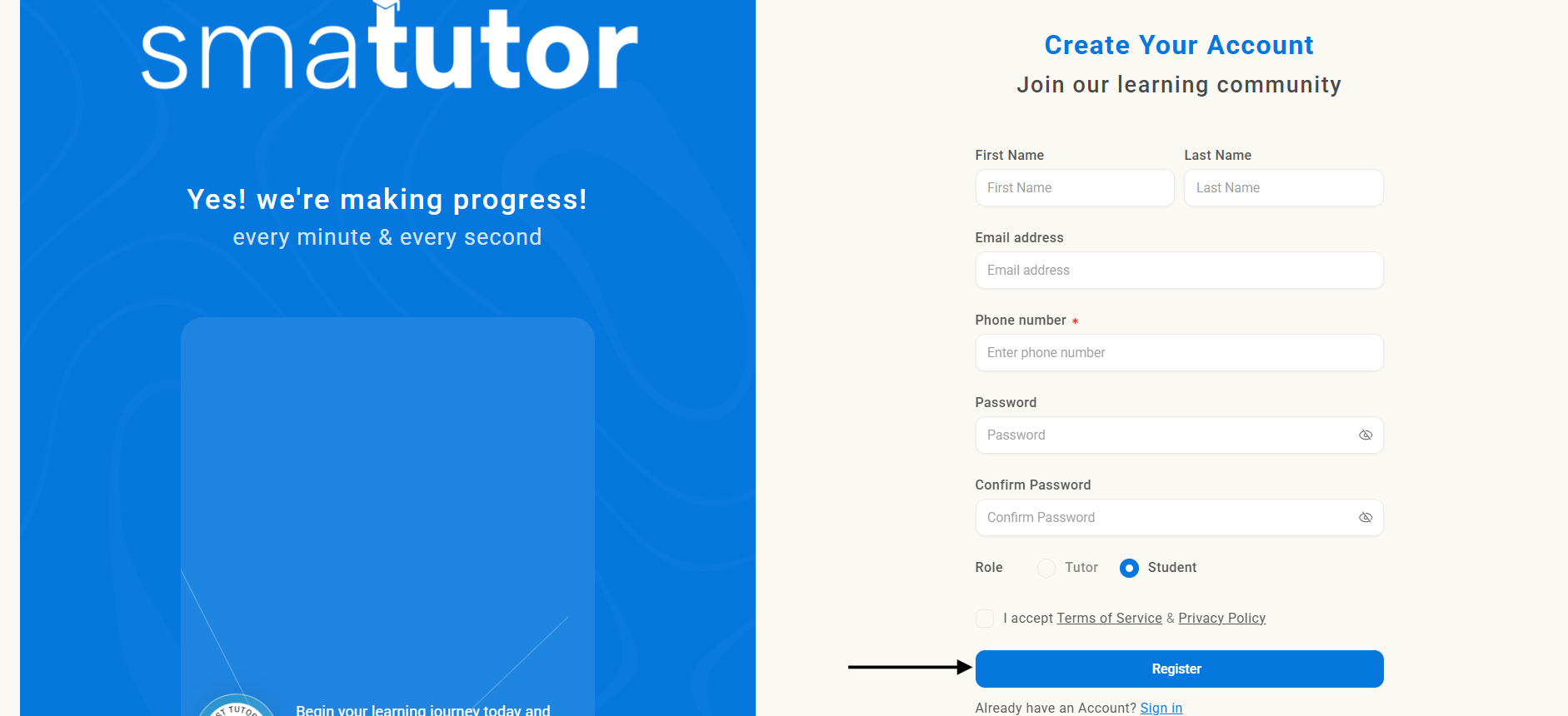 Allows a student to create a new account on the Smatutor platform.