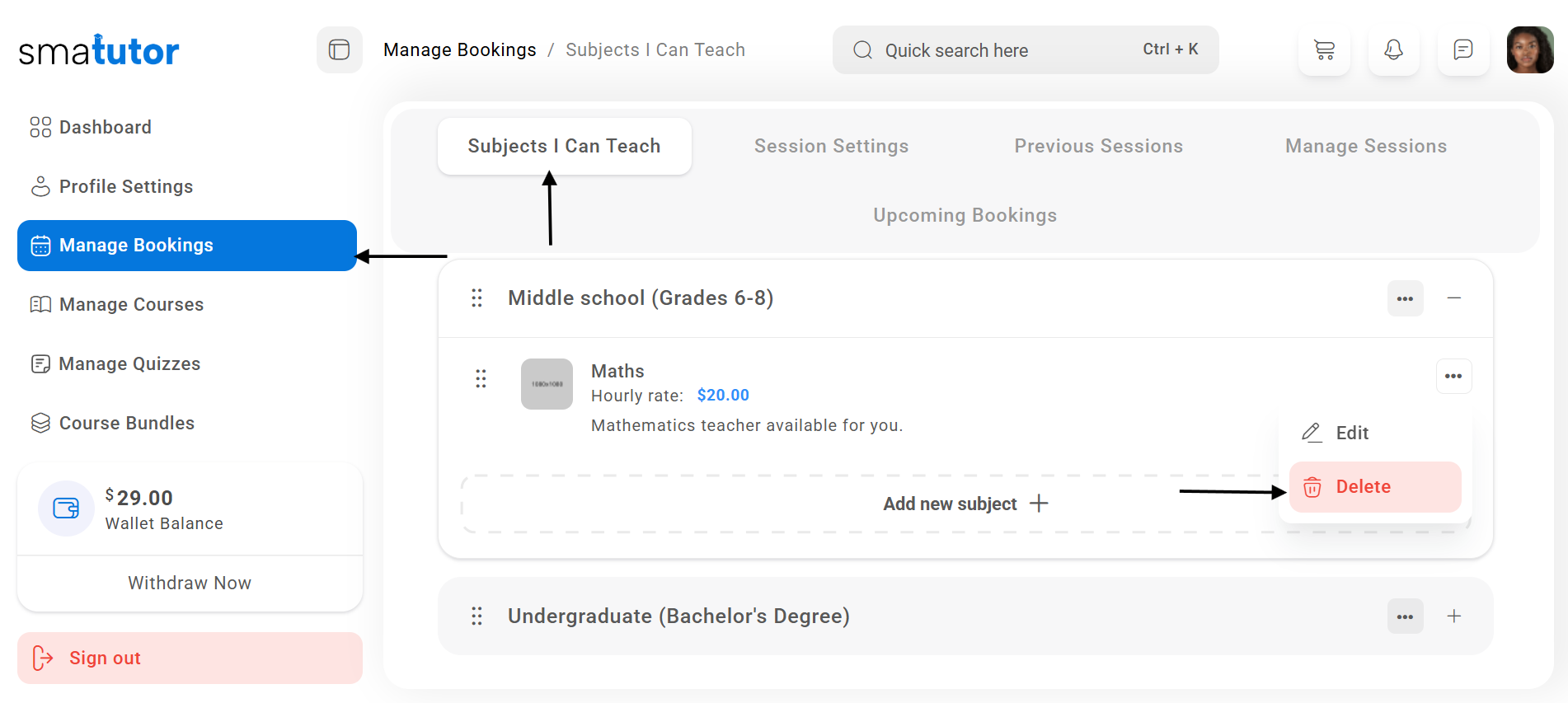 Steps for the tutor to delete a subject under a group